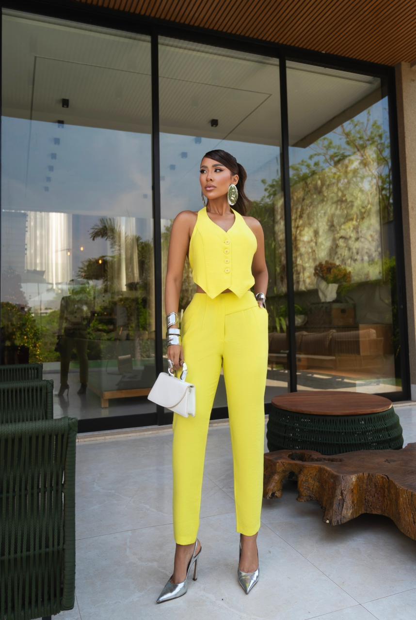Conjunto calça e cropped no tecido Alfaitaria de viscose.
