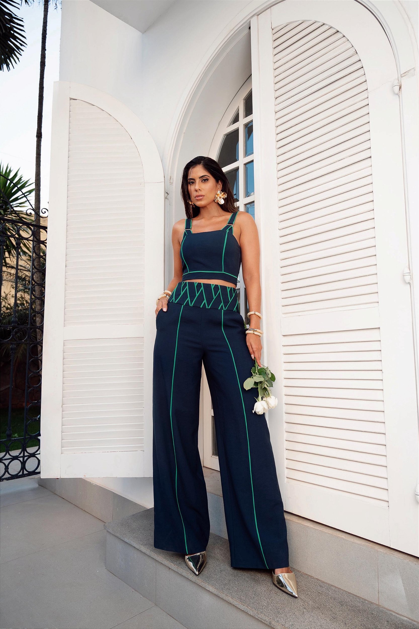 Conjunto calça e cropped no tecido Alfaitaria de viscose.